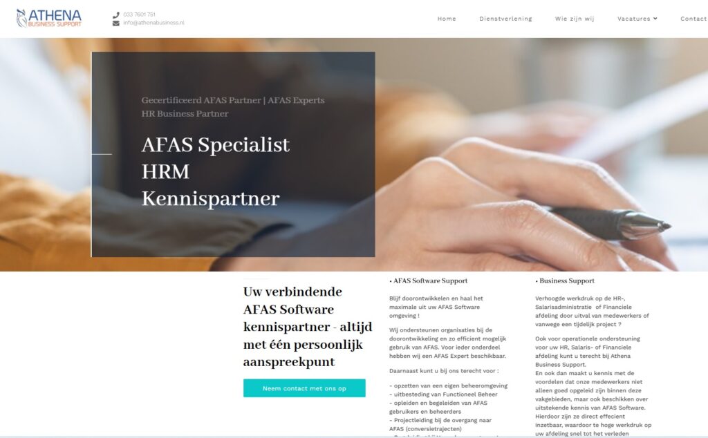 Athena Business Support is een dienstverlener op het gebied van AFAS consultancy. De Website is ontwikkeld met gebruik making van een Content management systeem. Dit houd in dat de klant zelf de website op eenvoudige manier zelf kan beheren en aanpassen. Foto’s of teksten toevoegen of aanpassen is voor iedere klant geen enkel probleem. In dit geval is gekozen WordPress als CMS.