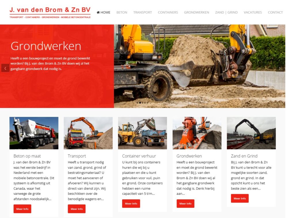 John van de Brom & zv is een leverancier voor zand, grond, grint en beton. De Website is ontwikkeld met gebruik making van een Content management systeem. Dit houd in dat de klant zelf de website op eenvoudige manier zelf kan beheren en aanpassen. Foto’s of teksten toevoegen of aanpassen is voor iedere klant geen enkel probleem. In dit geval is gekozen Joomla als CMS.